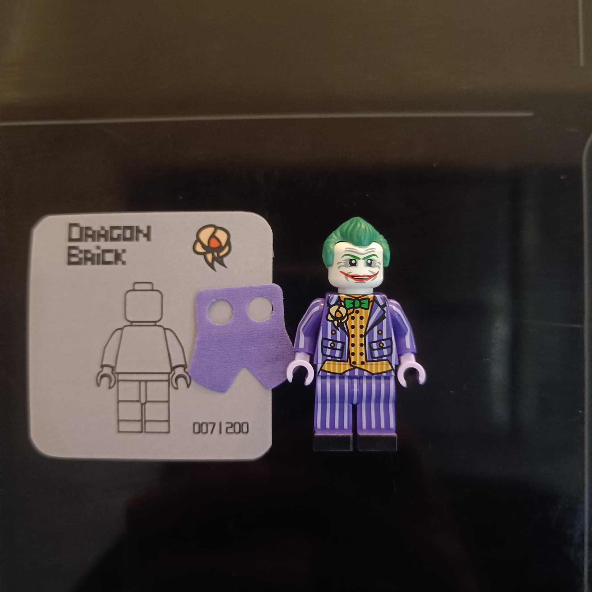 Dragon Brick Arkham Joker (Pad Printed) Minifigure Figure has barely been touched, only been displayed and photographed. Figure includes custom moulded Hairpiece and custom Waist Cape for Coattails. Figure comes with Verification card with information and number.
