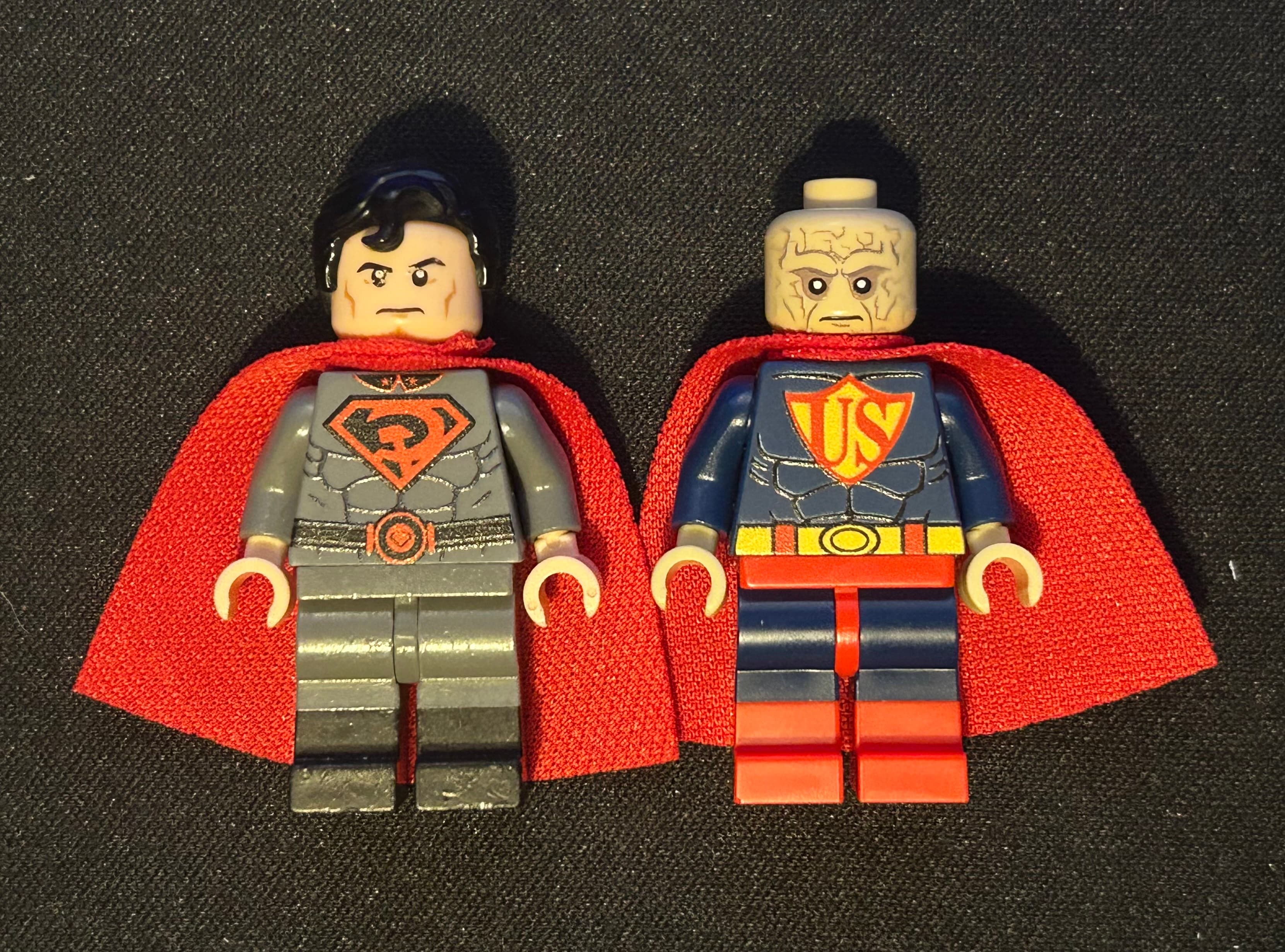 Torsos & bizarro head are uv printed by bizarro bricks all parts are all genuine lego capes are soft cloth